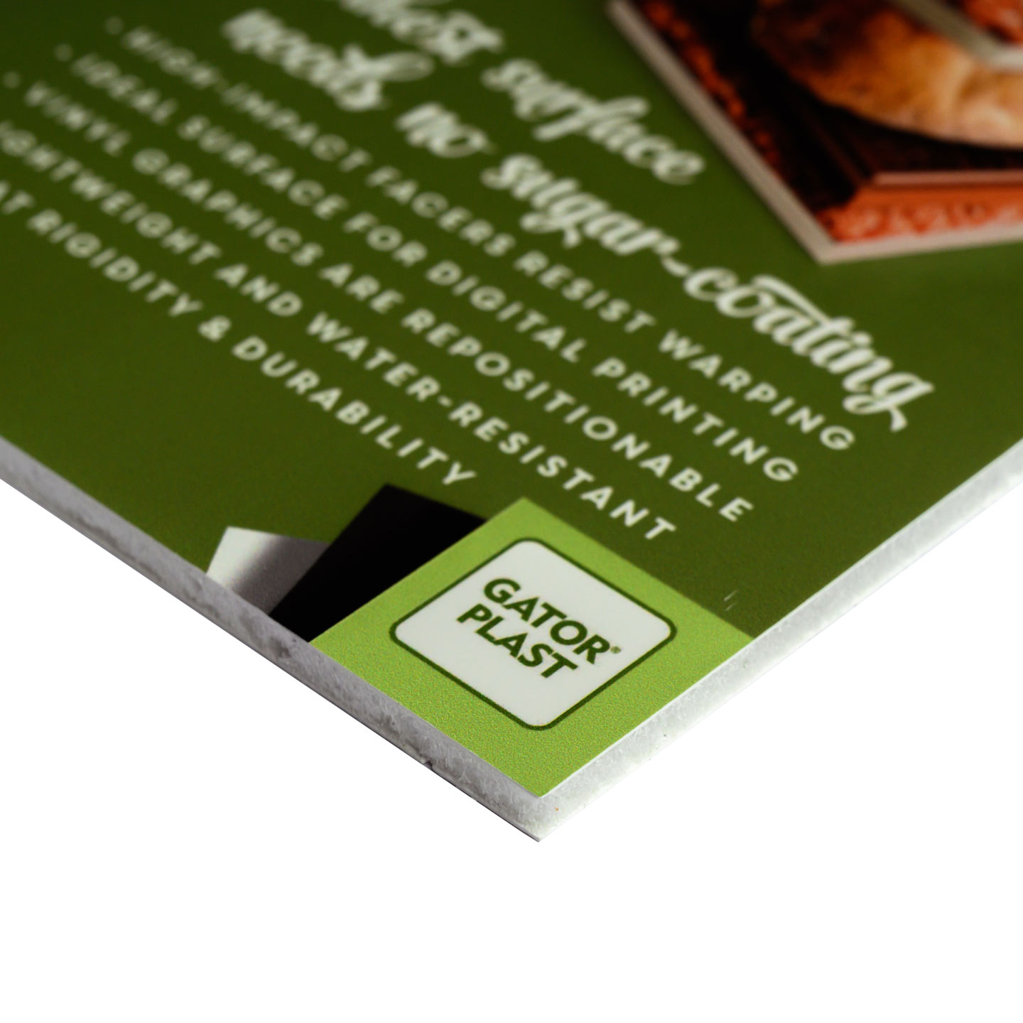 The plastic facers of GATORPLAST allow for more vibrant colors and vivid images, making this high performance foam board an excellent solution for digital printing applications. The high-impact facers resist warping, are moisture-resistant, and allow for repositionable vinyl graphics.