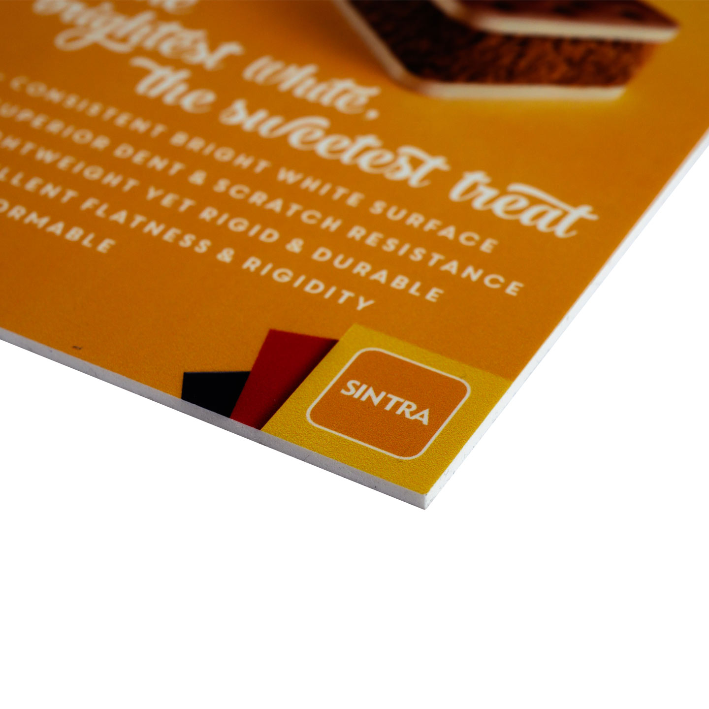 As the original, market-leading expanded PVC board, SINTRA provides a premium surface with a bright white low gloss satin finish for high quality printing results, as well as superior durability for more demanding mounting or fabricating applications. Mold it, shape it, form it, cut it - add excellent dent & scratch resistance and you’ve got a solution for almost any project.